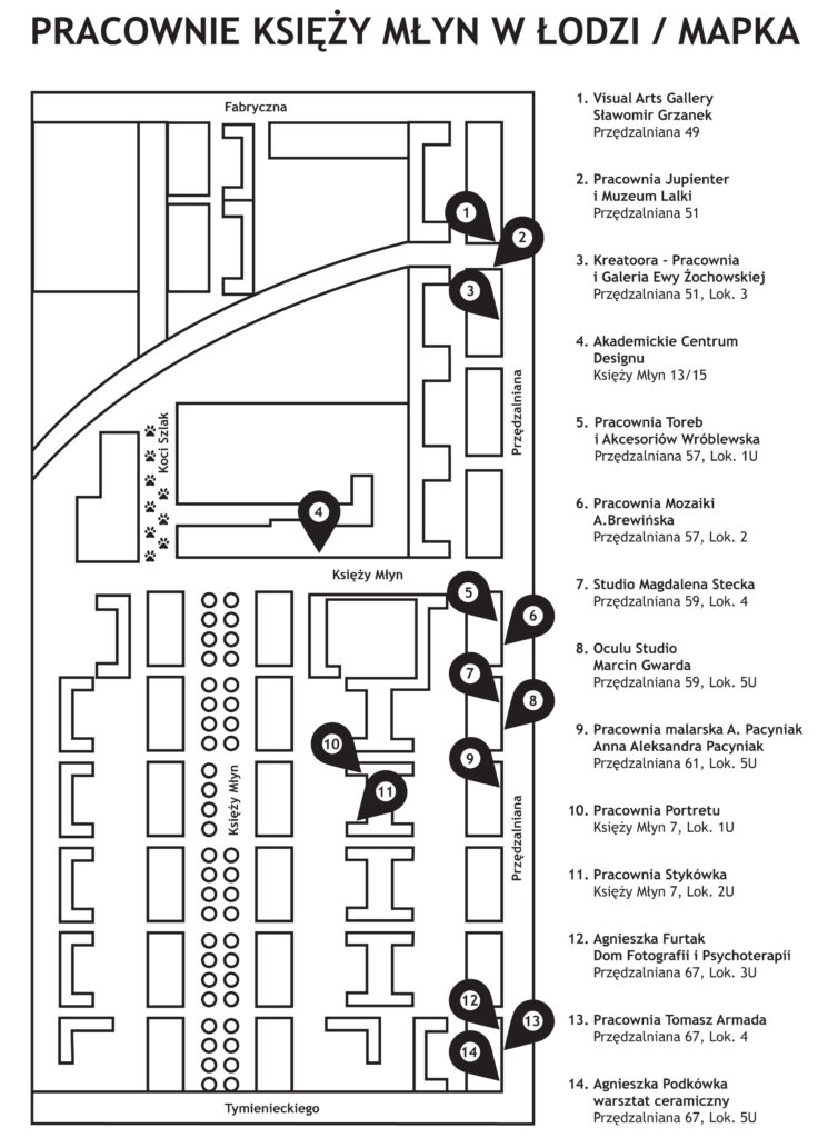 Pracownie Księży Młyn to miejsce, które ożywia artystyczne życie Łodzi. To kilkanaście pracowni artystycznych na terenie zabytkowego i zrewitalizowanego osiedla Księży Młyn. Mieszczą się w murach XIX-wiecznych domów robotniczych, łącząc historyczną industrialną architekturę dawnego imperium fabrycznego Karola Scheiblera ze sztuką współczesną i wysokiej klasy rzemiosłem artystycznym. Każda pracownia snuje swoją unikalną opowieść poprzez różnorodne formy artystycznego wyrazu, takie jak: malarstwo, grafika, kolaż, plakat, fotografia, moda, biżuteria czy ceramika.