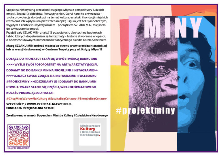 Projekt „Miny” to próba spojrzenia na historyczną przeszłość tego miejsca z perspektywy ludzkich emocji. Zapisem tak pojmowanej historii są obiekty powstałe na warsztatach monotypii i poezji haptycznej trwale zainstalowane w przestrzeni osiedla, tworząc punkty interaktywnego spaceru szlakiem „Min”. Za każdym z obiektów kryje się historia- fantazmat, poetycka opowieść stworzona w oparciu o wspomnienia mieszkańców pofabrycznego osiedla. Istnieje również możliwość wysłuchania wszystkich historii poprzez zeskanowanie kodu QR przekierowującego na stronę internetową projektu. Początek spaceru stanowi złota rzeźba ready made przedstawiająca… goryla. Rzeźba czy antyrzeźba? A może nasz własny emocjonalny ślad w historii? Jest to symboliczne miejsce do wykrzyczenia swoich emocji. To jednocześnie artystyczna prowokacja stanowiąca zaproszenie do dyskusji na temat kultury, estetyki i kondycji miejskich rzeźb oraz ich wpływu na przestrzeń miejską. Goryl nosi imię „Karol”. To na cześć Karola Scheiblera.