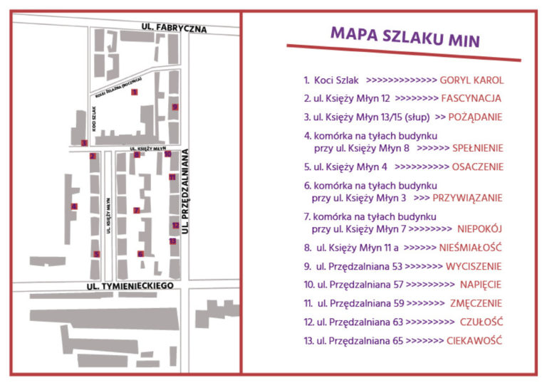 ZWIEDZANIE KSIĘŻY MŁYN SZLAKIEM MIN REALIZOWANE BYŁO W LATACH 2019 – 2021. OBECNIE, ZE WZGLĘDU NA KONIECZNOŚĆ DEMONTAŻU WIĘKSZOŚCI TABLIC I RZEŹBY GORYLA KAROLA Z POWODU GENERALNEGO REMONTU TERNU ZABYTKOWEGO OSIEDLA, NIE JEST TO MOŻLIWE. KTO WIE, MOŻE SZLAK MIN JESZCZE POWRÓCI?